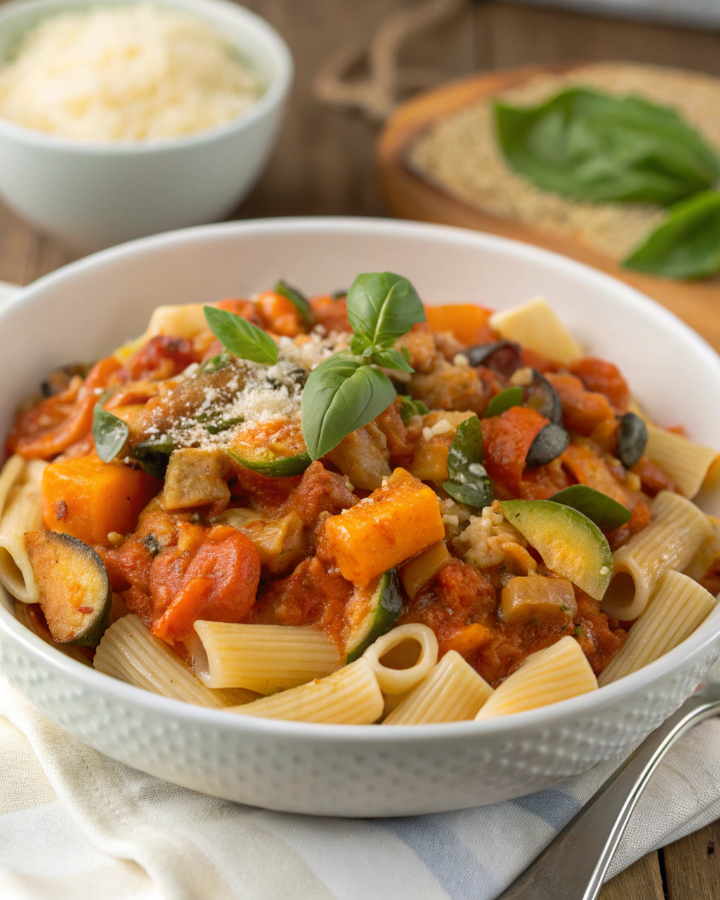 Questo piatto è meraviglioso appena fatto, magari accompagnato da un’insalata fresca condita con olio e limone per una nota agrumata che pulisce il palato. Un bicchiere di vino bianco secco o un rosso giovane sono perfetti compagni di viaggio. Ideale nelle sere d’autunno o in primavera, quando vuoi qualcosa di confortante ma anche leggero. Perfetta anche per una cena informale tra amici, dove il ragù di verdure stupisce senza appesantire.